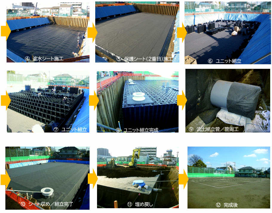今回は最終回としまして、ハイドロスタッフの「施工順序」および「施工事例」について紹介させていただきます。1.ハイドロスタッフの施工順序(流出抑制遮水シートタイプの場合)
