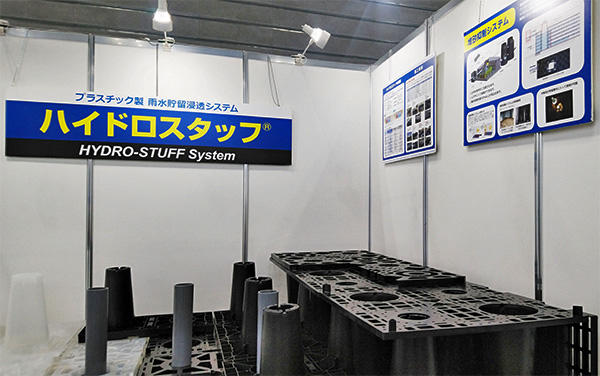 今回は雨水の有効利用、水害防止製品のハイドロスタッフの他、省スペース設置が特徴の地中埋設用の浸透管スティックフィルターも初めて展示しご好評をいただきました。